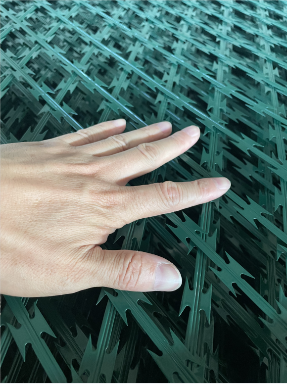 金屬刀刺隔離網主要用于圍墻、獄墻、巡邏道,網孔是7.5cm*15cm選擇bt0-22型號刀片刺條焊接而成。表面做噴涂處理,顏色有草綠色、墨綠色、中灰色等。