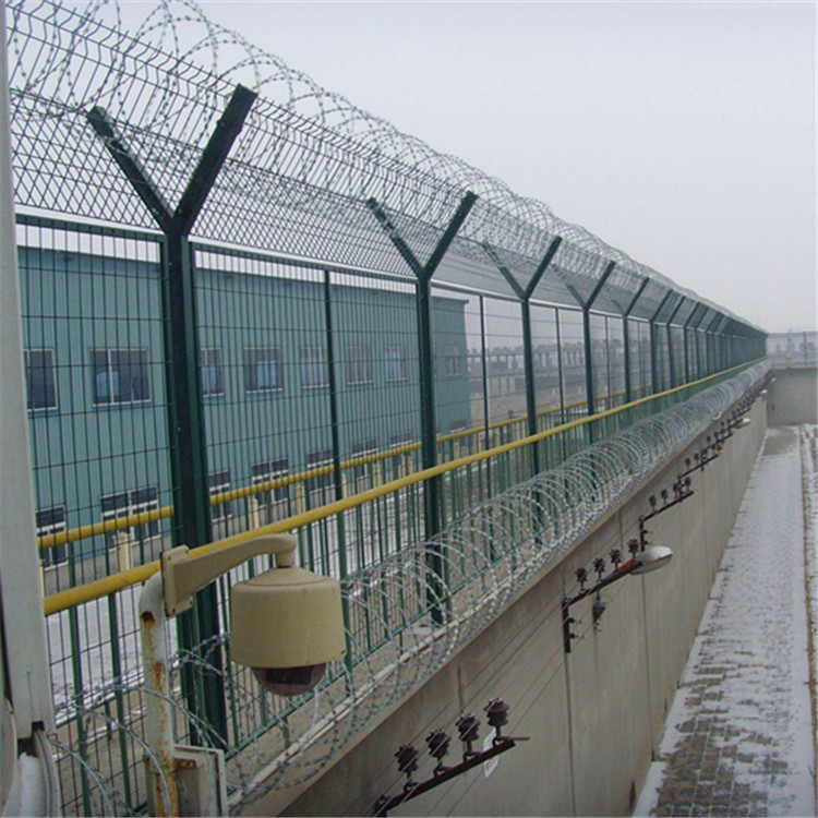 監獄鋼網墻加高網材質采用Q 235鋼材制作而成,該材質具有韌性大,硬度高的特點,是制作防御隔離網的上等選材。鋼網墻加高網的編織特點具有結構新穎、堅固緊密、網面平整、網孔均勻、防攀爬、防拆卸、防剪、抗腐蝕性強等特點。顏色可根據各監區的制作要求定制,常規顏色有草綠色、墨綠色、白色、灰色,鋼網墻一般頂端都設有V型支架與立柱焊接,材料通常選擇和立柱同等材料或者稍小規格材料搭配使用。V型型支架的加裝是為了將蛇腹形刀刺網固定在隔離網頂部,從而有效的增加監區隔離網的防攀爬性和安全性。