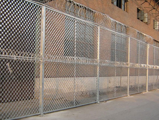 4、監(jiān)獄鋼網(wǎng)墻防攀爬能力極強(qiáng)、加強(qiáng)網(wǎng)片增加了其被破壞的程度、使用時(shí)間長(zhǎng)、堅(jiān)固耐用。螺旋型交叉刀片刺網(wǎng)是在兩條刀片刺網(wǎng)之間以不銹鋼片和鍍鋅鋼片強(qiáng)力夾扣,展開(kāi)后即呈交叉狀,美觀又實(shí)用。