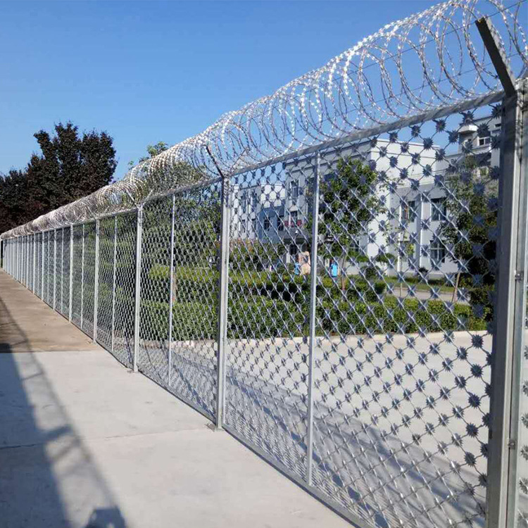 裝防拆卸刀刺網。刀刺網的直徑一般為500mm、 600mm、 800mm ,材質均為優質304不銹鋼,鎳含量8個以上。刺網芯線直徑