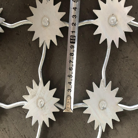1、梅花刺片:梅花剌片直徑不小于7.5cm (直徑6cm、7cm、8cm) ,刺片厚1.5mm ,采.用Q235低碳鋼板沖壓成型。梅花刺片用氬弧焊將梅花形刺片焊接在美格網的節點上,形成刺形保護,有效的防止了手握腳攀。