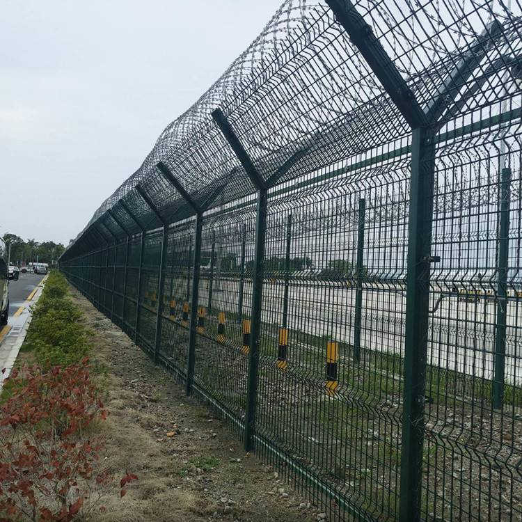 機(jī)場(chǎng)鋼筋網(wǎng)圍界又稱作機(jī)場(chǎng)圍界網(wǎng),是由V型支架立柱加強(qiáng)型焊接片網(wǎng) ,安全防盜連接件和熱鍍鋅刀片刺網(wǎng)組成強(qiáng)度和安全防御性級(jí)別很高。被廣泛應(yīng)用在機(jī)場(chǎng),軍事基地等高安全場(chǎng)所。安全防盜接頭和熱浸鍍鋅刀片或鰓繩網(wǎng)是具有較高強(qiáng)度和安全保護(hù)水平的柵欄網(wǎng)產(chǎn)品之一。