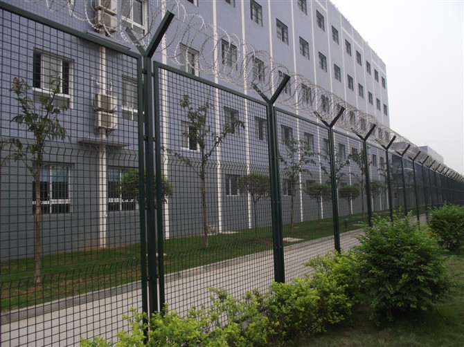 看守所監墻內側刀刺鋼網墻高度是多少。看守所刀刺鋼網墻高度有2.5m和4.5m兩種,也是常用的兩種。這兩種高度都包括頂部50公分的蛇腹型刀刺網,底部為刀刺鋼網墻。4m高刀刺鋼網墻可以用上下兩片來連接。